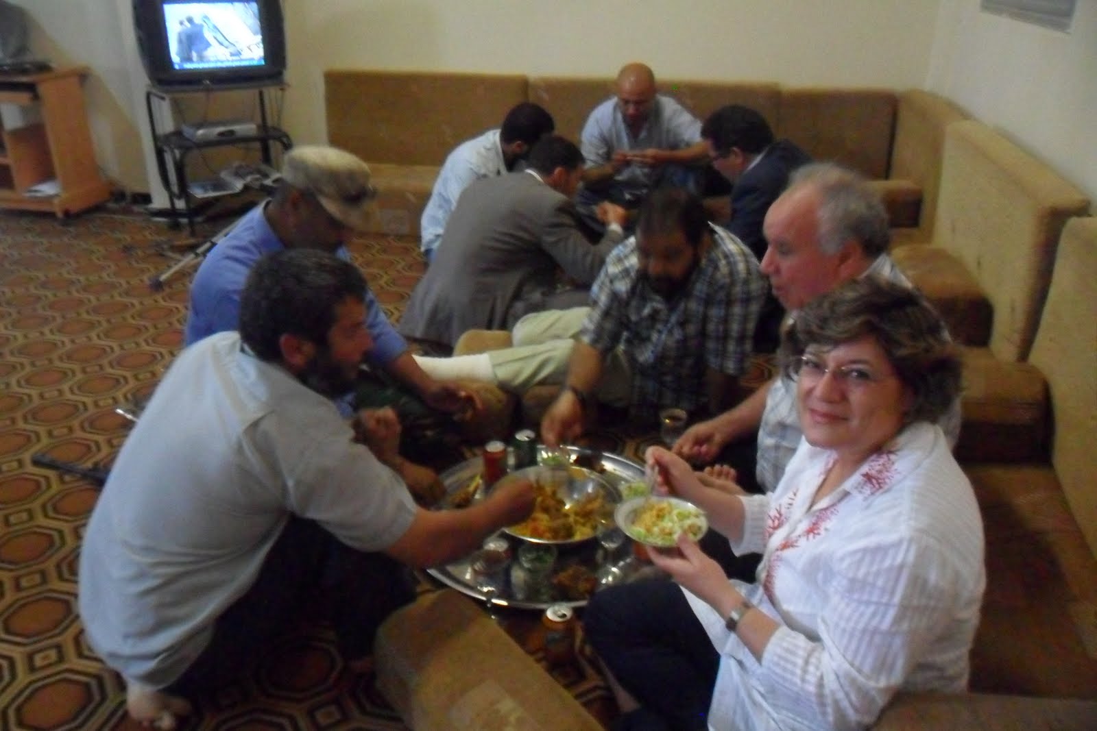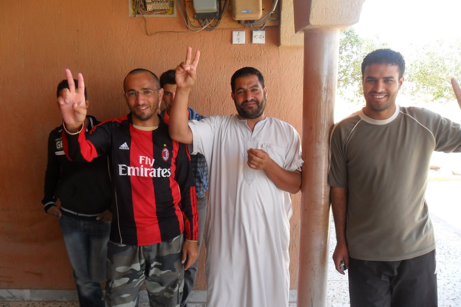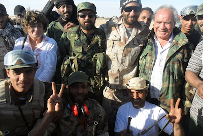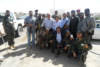 De fato sem gravata, os meus acompanhantes querem ficar na fotografia na linha da frente. Ahmed Chebani era advogado de direitos de autor em Vancouver, onde o pai perseguido por Khadaffi, estava exilava dezenas anos. Largou tudo no final de Fevereiro para vir parar ao "operations center" da guerra contra Khadaffi. O outro, Mourad Hmeima, era embaixador em Genebra, em Novembro recebera-me, numa delegação do PE, em Tripoli para discutir o acordo-quadro que a UE estava a negociar com Khadaffi. Largou a embaixada em Genebra no dia 25 de Fevereiro, deixou mulher e filhos no Cairo temporariamente e veio trabalhar para libertar o seu país do torcionário Khadaffi. Ajudou-me a organizar a visita e explicou-me o que queria dizer o que me gritavam os miudos "Libia, Hourra, hourra! Khadaffi atla barra!": Libia livre, livre! Khadaffi para a rua!