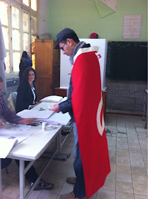 As portas fecharam, a sala acalmou, a abertura dos boletins de voto começou, a pisar ovos. Estão todos cansados. A representante do Polo Modernista (a quem eu soprara a sugestão ao ouvido) sugere que vão todos ajudar a mesa a abrir os setecentos e tal votos. E assim sucede, a menina com ar parisiense do Polo ao lado do rapaz do Ennahdha, que veste um polo com a inscrição FCBarcelona nas costas...