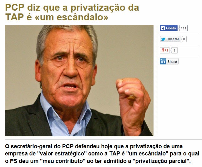 Eu também preferia que a TAP se mantivesse sob controlo público. O problema é que, como mostrei algures, nenhum investidor privado está disponível para "queimar" centenas de milhões de euros para recapitalizar a TAP sem ter o controlo da empresa, ficando à mercê das idiossincrasias políticas de cada governo e da sua vulnerabilidade às greves políticas na empresa (como tem sucedido até aqui). Não é possível ter o "sol na eira e a chuva no nabal".